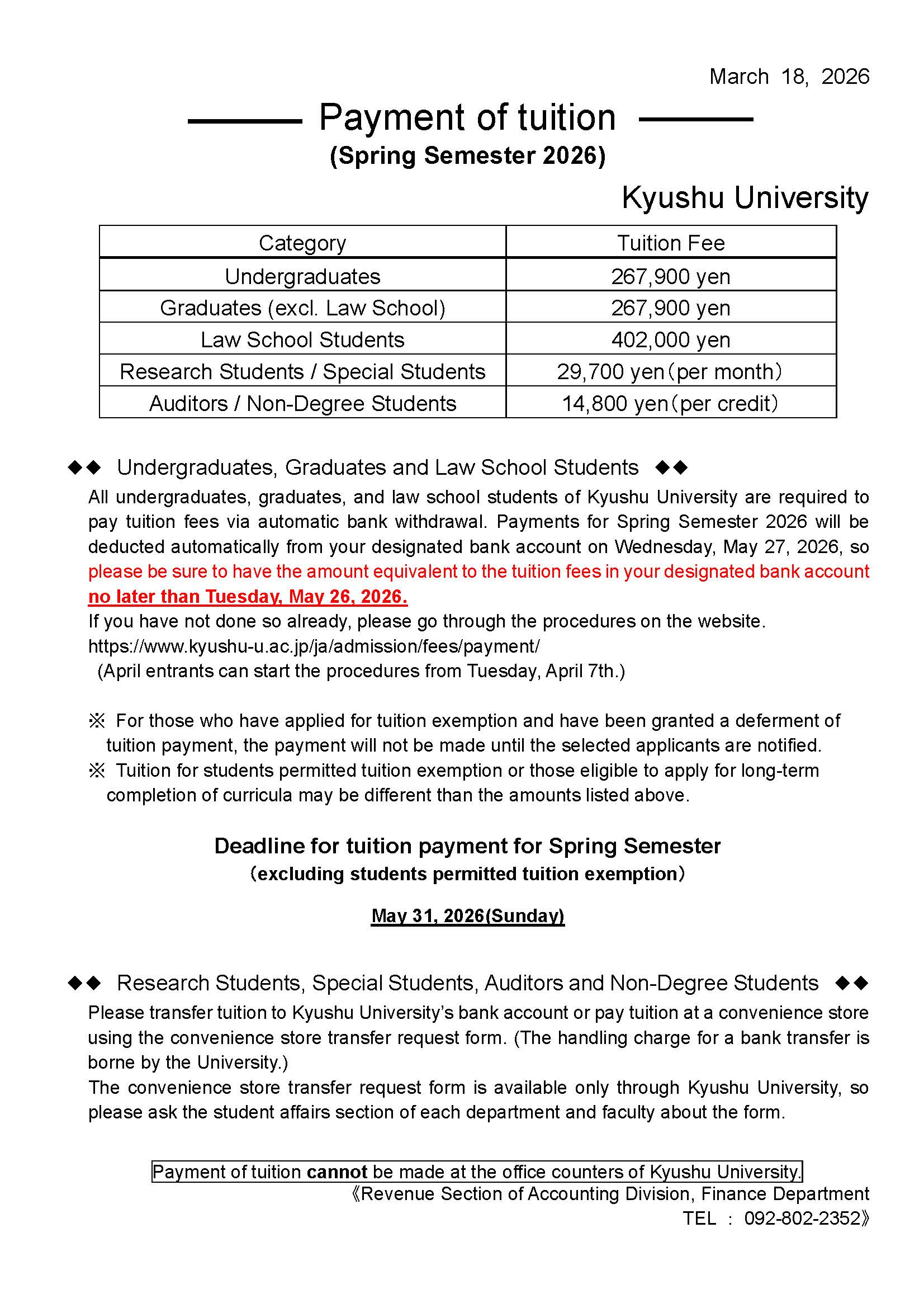 Website (Payment of tuition | Tuition, Fees, & Scholarships | Admissions | KYUSHU UNIVERSITY)