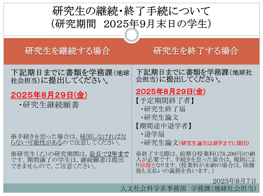 【修正版】研究生の継続・終了手続について(研究期間 令和7年9月末日の学生)