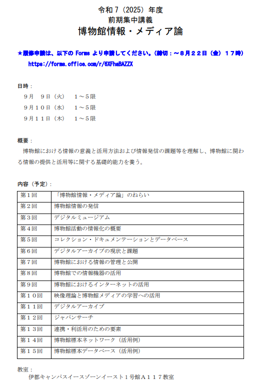 令和7年度学芸員科目「博物館情報・メディア論」開講について